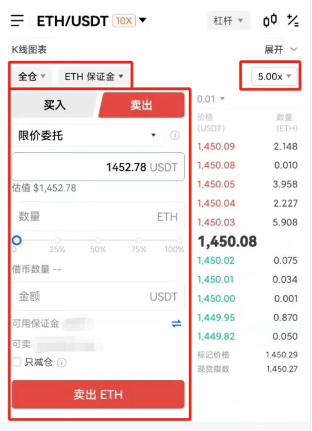 进入ETH/USDT杠杆交易页面,选择卖出,选择全仓/逐仓模式,选择委托类型、保证金类型(ETH保证金)、交易价格,交易数量/金额,点击「卖出ETH」按钮即可下单成功。挂单成交后,同样可以在仓位界面查看持仓相关数据。