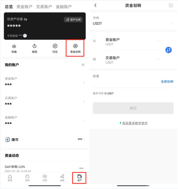 方法一:进入“资产”页面——选择资金划转,进行操作